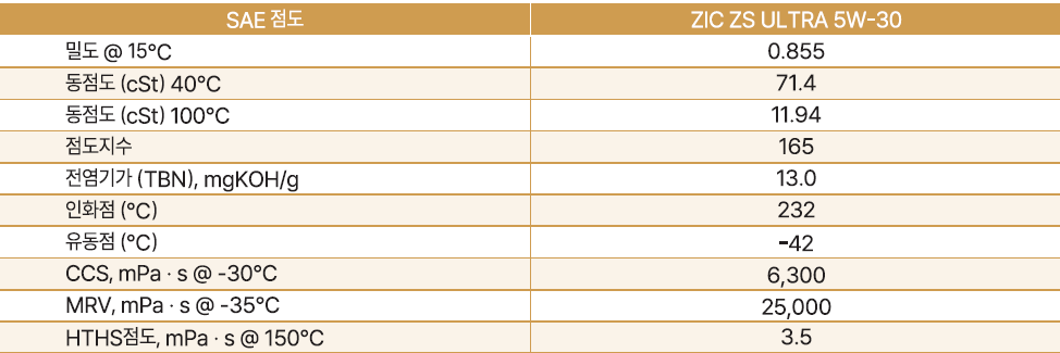 - ZIC ZS ULTRA 5W-30은 최신 글로벌 상용차량 제조사의 공식 승인을 받은 최고급 100% 합성엔진오일입니다.